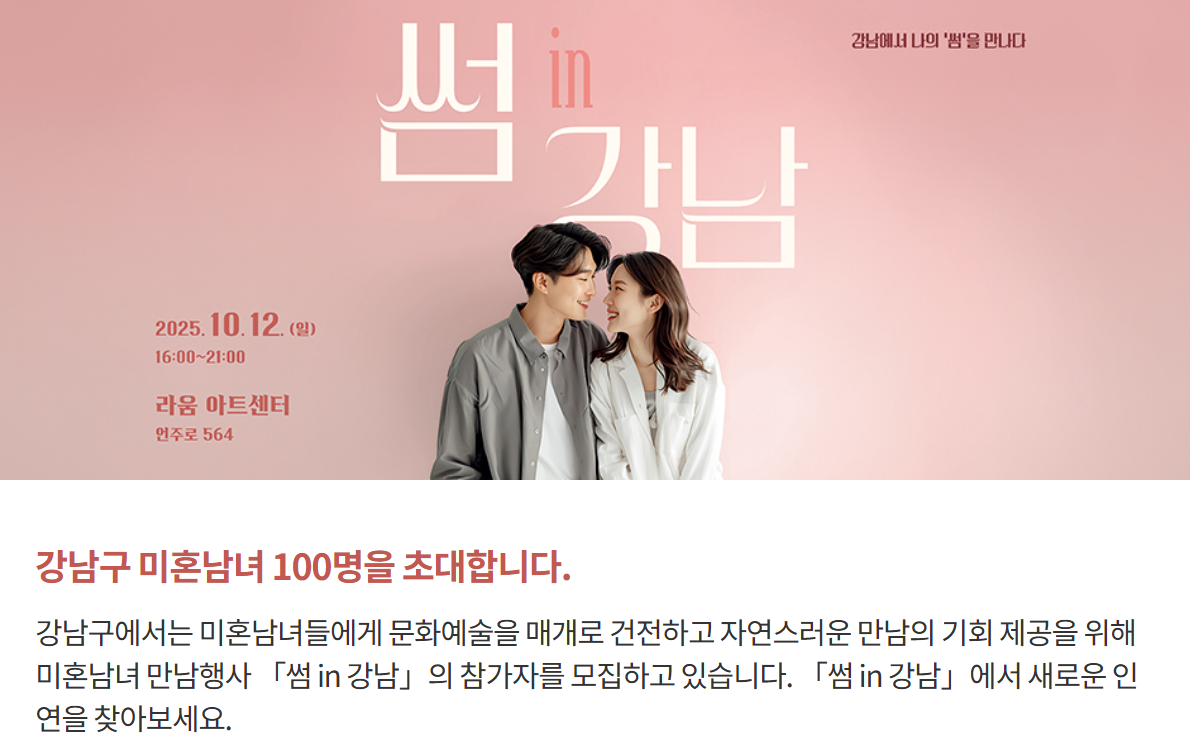 강남구청에서 주최하는 '썸 in 강남'은 미혼남녀 100명(남 50, 여 50)을 대상으로 문화예술을 매개로 건전하고 자연스러운 만남의 기회를 제공하기 위한 공식 만남행사인데요. 강남구 거주 또는 강남구 소재 직장에 재직 중인 미혼 직장인(자영업, 프리랜서 포함) 중 27~39세 (1986~1998년생) 미혼남녀를 대상으로 진행되는 행사입니다.