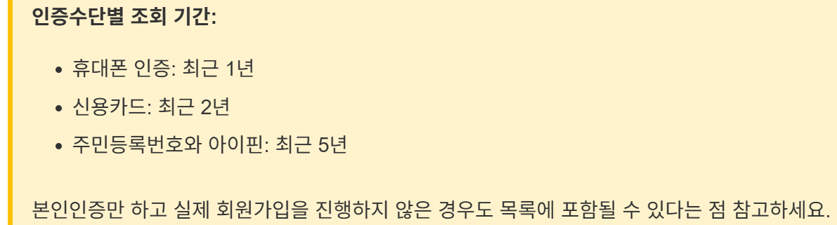 본인확인 내역을 기반으로 제공되는 이 서비스는 회원가입 시 본인인증을 했던 웹사이트들을 자동으로 조회해 주지만, 조회기간은 아래와 같이 상이할 수 있습니다.