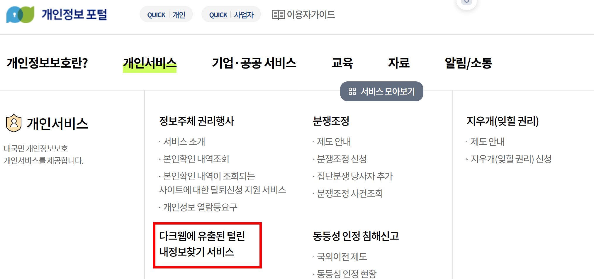 웹사이트 회원 탈퇴 서비스 외에도 개인정보 포털에서는 '다크웹에 유출된 내 정보 찾기 서비스' 또한 운영됩니다. 자주 사용하는 아이디와 비밀번호를 입력하면 다크웹에 유출되었는지 확인할 수 있으니, 정기적으로 내 개인정보를 점검하시는데 도움이 되실 겁니다.