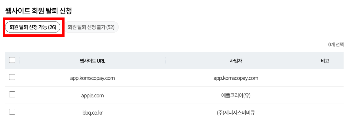 모든 사이트가 일괄 탈퇴 가능한 것은 아닙니다. 회원 탈퇴 시 금전적 손해나 불이익이 발생할 수 있는 금융 사이트, 연계 가입으로 다른 사이트 이용에 영향을 주는 경우, 아이디와 비밀번호로만 로그인하는 사이트 등은 일괄 탈퇴 신청이 불가합니다.