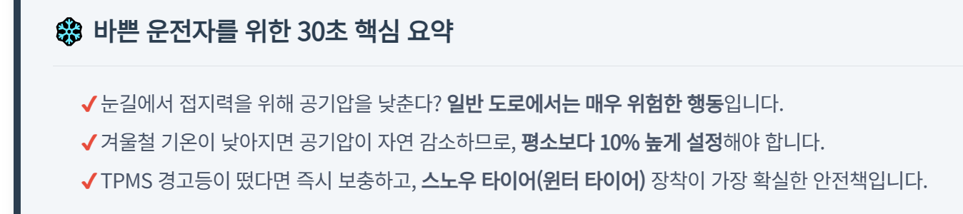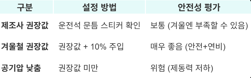 공기압 조절은 최소한의 안전장치일 뿐이며, 눈길과 빙판길에서 가장 확실한 안전을 보장하는 것은 공기압 조절이 아닌 '윈터 타이어(스노우 타이어)' 장착입니다.
