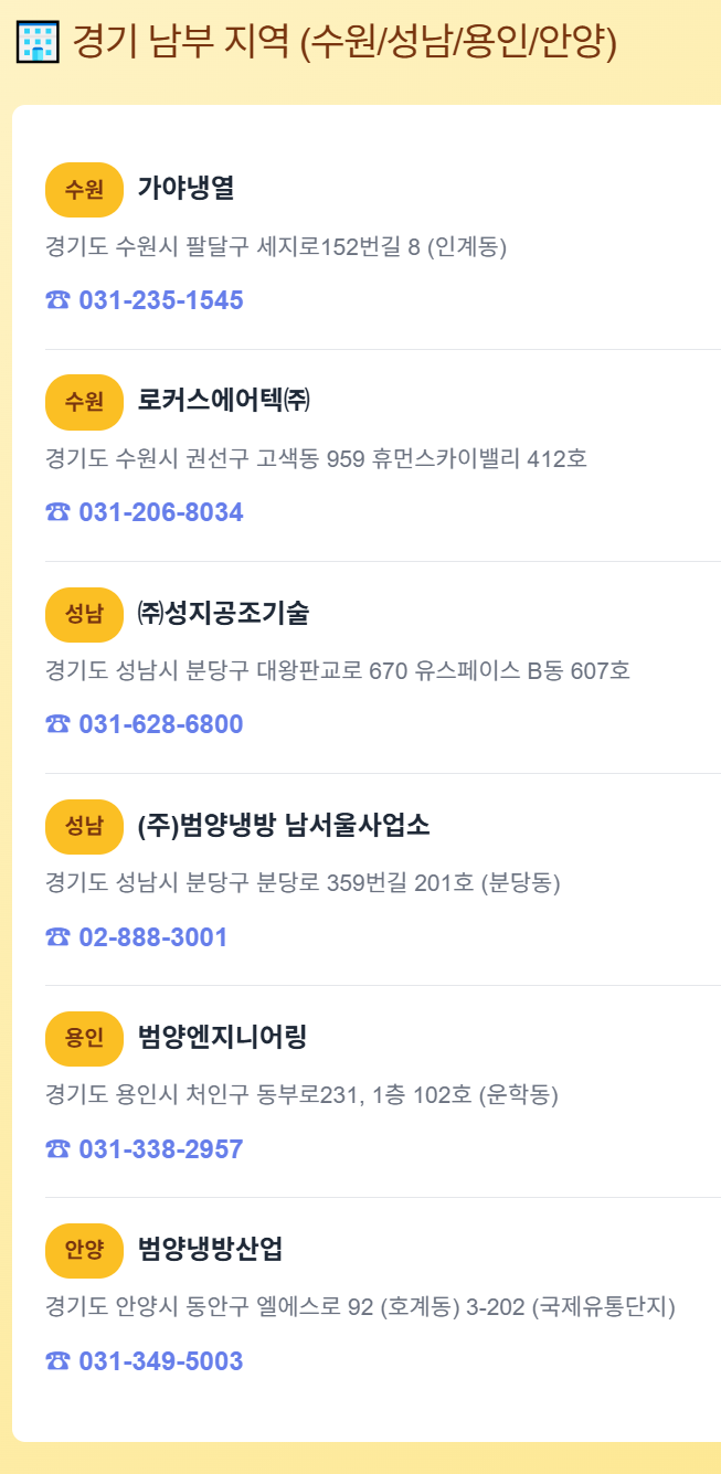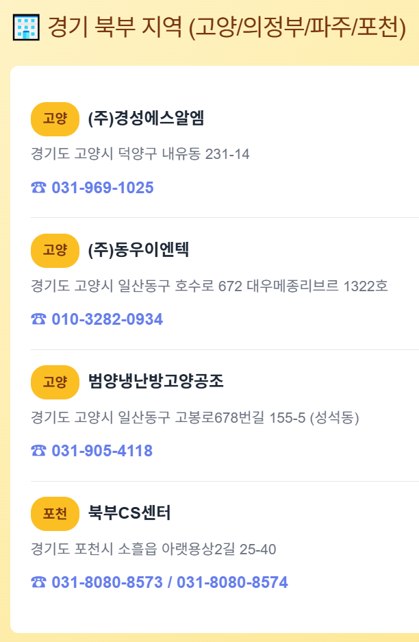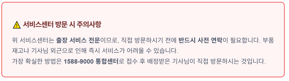 경기도 내에는 주요 도시마다 서비스센터가 배치되어 있어, 대부분 당일 또는 익일 방문이 가능한 상황입니다. 아래는 경기 남부와 북부의 주요 센터 정보입니다.