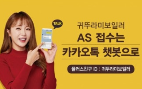 카카오톡에서 카카오톡에서 "귀뚜라미보일러"를 친구 추가하면 대화형 인터페이스로 더욱 간편하게 AS를 신청할 수 있고, 위치 정보를 자동으로 인식하여 가까운 경기도 서비스센터로 연결해 드리니 아주 편리합니다.