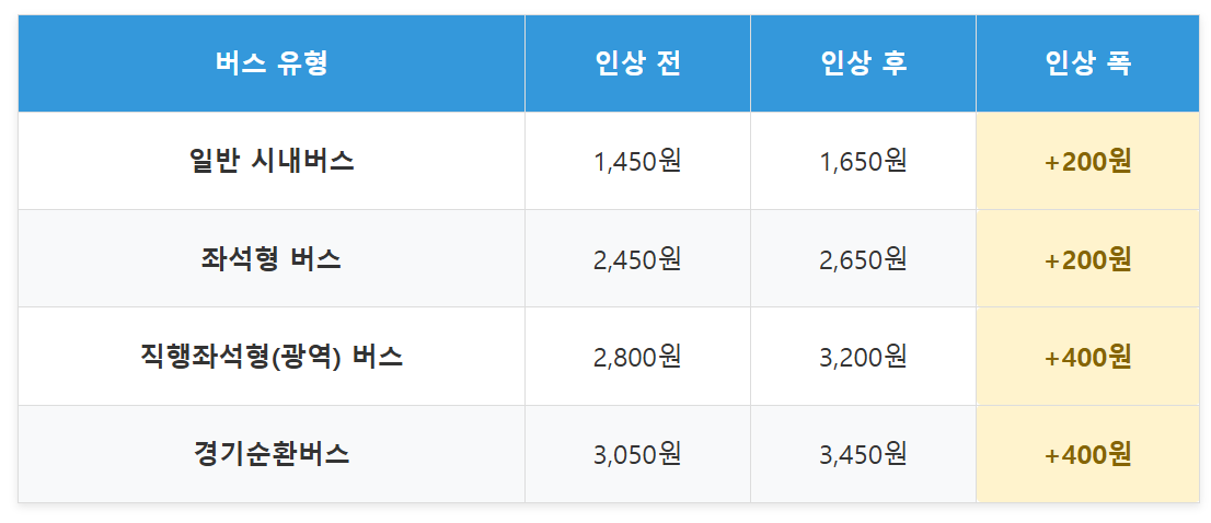 경기도 버스 요금은 버스 유형에 따라 200원 또는 400원이 인상되는데요. 아래 표로 한눈에 보기쉽게 정리해 봤습니다.