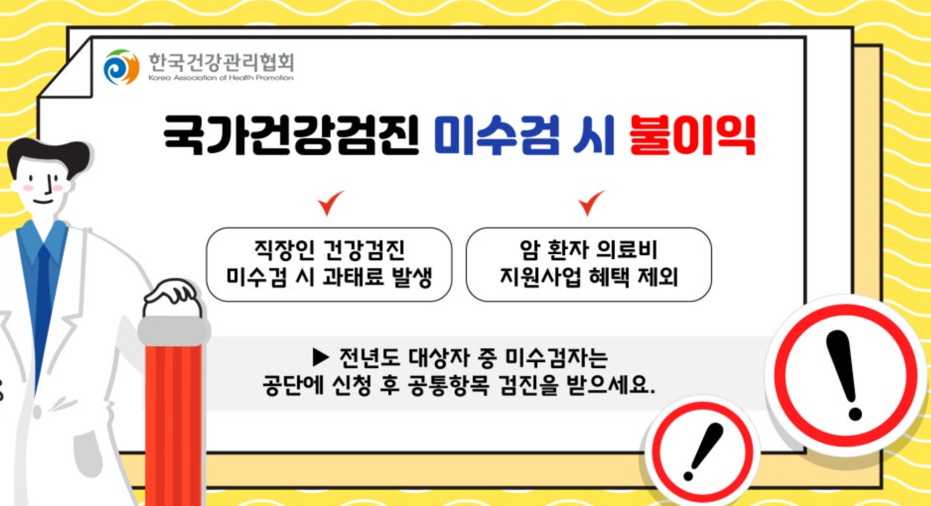 - 만약 사업주가 1년에 2회 이상 검진을 안내했음에도 근로자가 미수검할 경우, 근로자에게 최대 300만원 과태료.