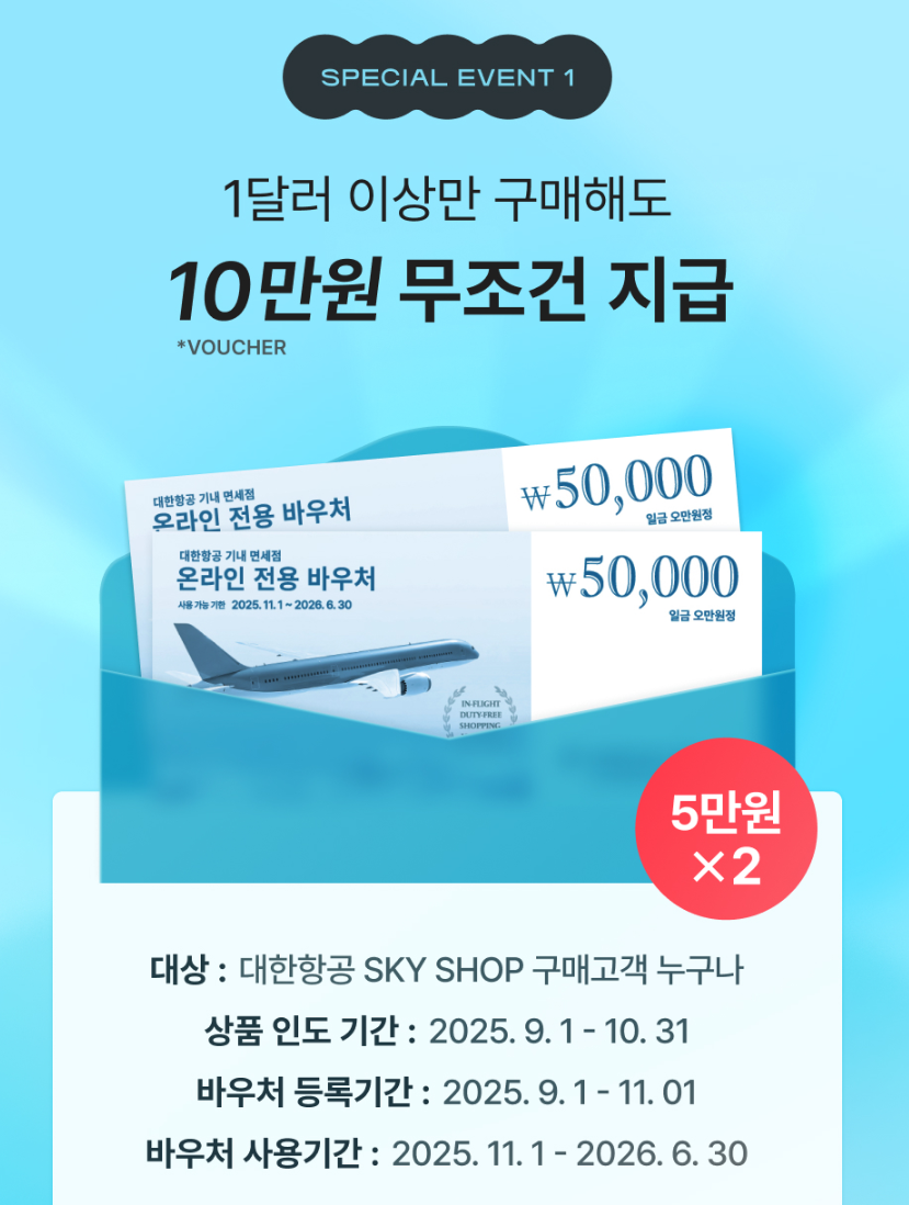 기내 또는 온라인 스카이샵에서 단 1달러 이상만 구매하면, 누구나 5만 원 할인권 2장을 받을 수 있습니다. 구체적인 할인권 사용법을 살펴보면, 받은 할인권은 다음번 스카이샵 이용 시 200달러 이상 구매할 때 각각 사용할 수 있는데요. 즉, 400달러 이상 구매 시 두 장의 할인권을 모두 활용하여 총 10만 원을 절약할 수 방법입니다.