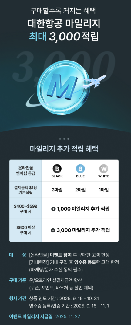 대한항공이 스카이샵 출범 56년 만에 처음으로 선보이는 블랙플라이데이 이벤트가 시작되었는데요. 이번 이벤트는 9월 1일을 시작으로 10월 31일까지 진행됩니다. 기내 또는 온라인 스카이샵에서 단 1달러 이상만 구매한 고객들을 대상으로 실질적이고 파격적인 혜택을 제공하는 이벤트로 정식 명칭은 '블랙플라이데이'입니다. 어떤 혜택들이 주어지는지 빠르게 알아보겠습니다.
