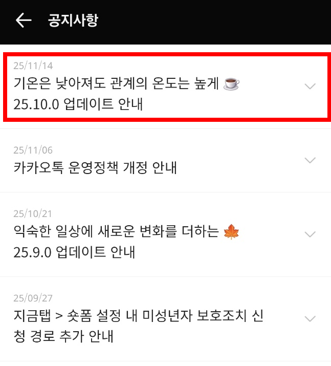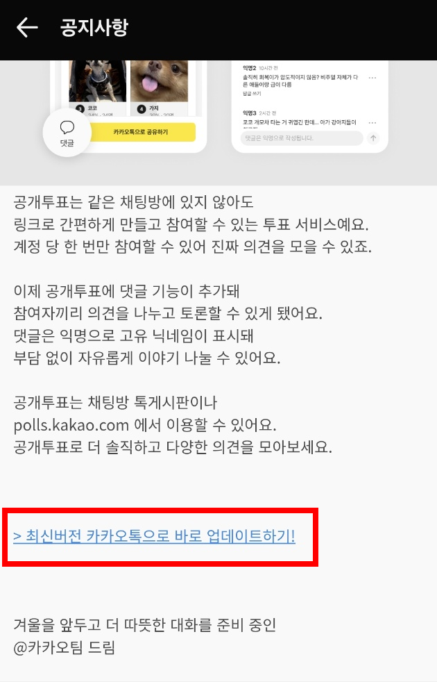 5. 공지사항에서 '최선버전으로 카카오톡으로 업데이트하기'를 클릭