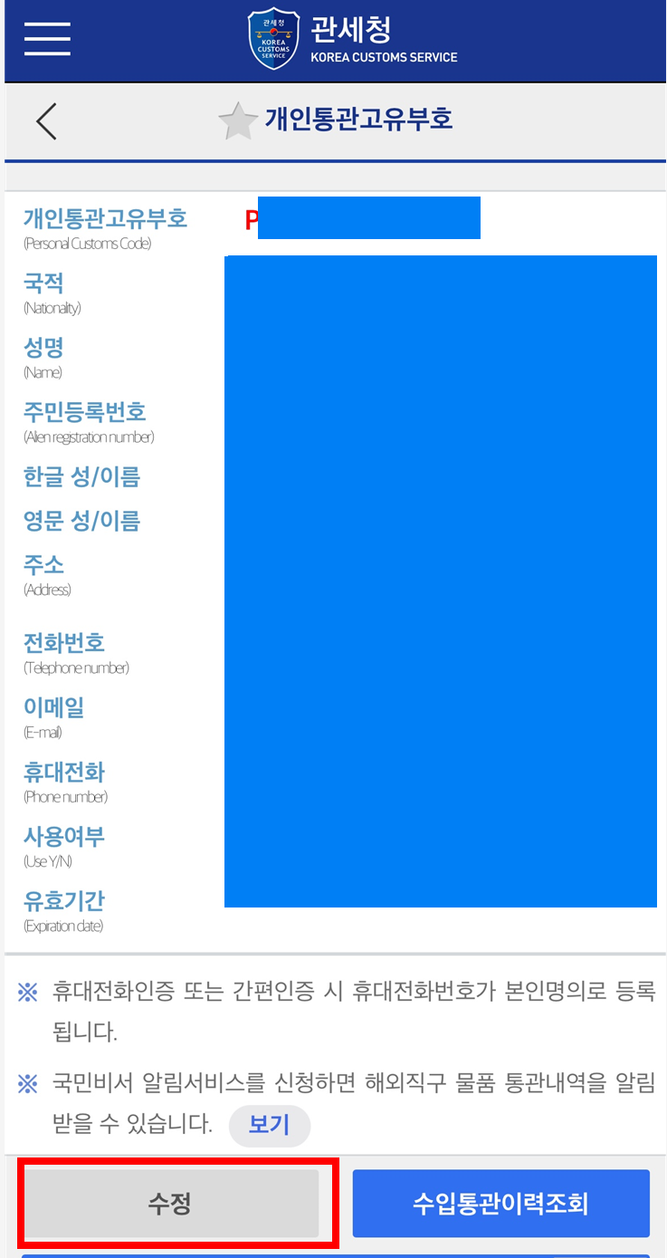 '조회'를 눌러 인증을 합니다. 인증을 하고나면, 기존에 사용하던 개인통관번호 P로 시작하는 넘버가 보입니다. 이 화면의 오른쪽 하단의 '수정'을 누릅니다.