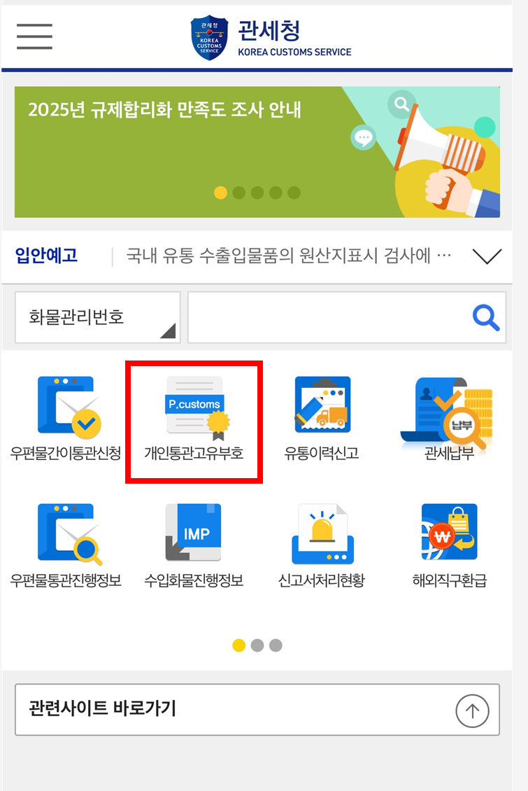 포털 사이트에 '관세청 유니패스'를 검색하거나 개인통관고유부호 발급 사이트에 접속합니다.