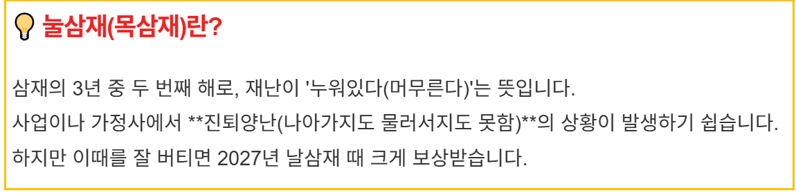 눌삼재는 가정불화를 일으키는 기운이 강해요. 밖에서 받은 스트레스를 집에서 풀지 말고 밖에서 해결하세요. 2026년의 이별수는 재결합이 어려우니, '경청'과 '배려'가 최고의 해결책입니다.