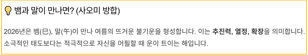 2026년 병오년(丙午年), 뜨거운 태양과 같은 붉은말의 해가 다가오고 있는데요. 지혜롭고 냉철한 판단력을 가진 뱀띠 여러분에게 2026년은 숨겨왔던 잠재력이 폭발하는 시기라고 할 수 있습니다. 뱀(巳)이 말(午)을 만나면 거대한 불기운을 형성하여, 그동안의 준비가 세상 밖으로 드러나고 화려한 조명을 받게 되는 중요한 한 해가 될 것입니다.