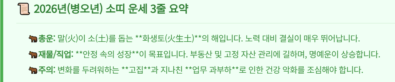 소띠에게 2026년은 **‘인수(印綬)’, 즉 문서운, 명예, 귀인의 운**이 강하게 들어오는 한해가 될 것입니다. 땅(소띠)에 불(말띠)이 온기를 더하니, 뿌리가 튼튼해지고 열매가 잘 맺히는 아주 길한 해입니다.