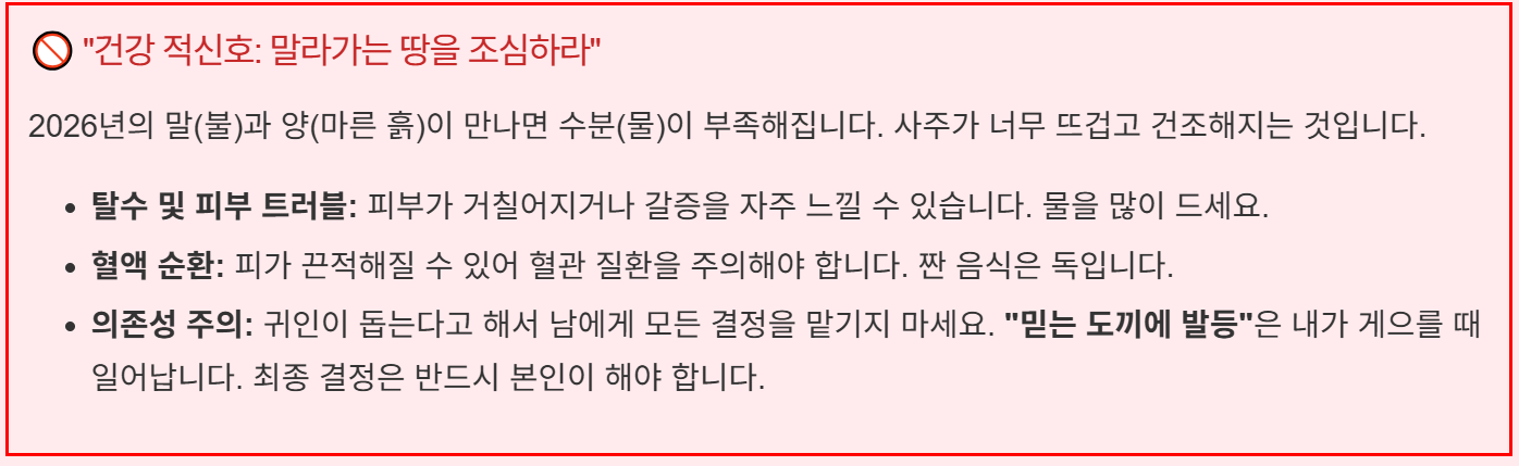 삼재는 아니지만, 운이 너무 좋을 때 생기는 부작용도 뒤따르기 마련입니다. 2026년 양띠의 유일한 약점은 '지나친 열기(조열함)'입니다.