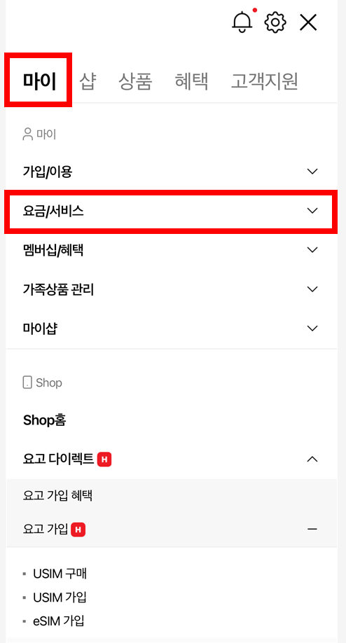 2. 맨 왼쪽의 "마이" --> "요금/서비스" 으로 들어갑니다.