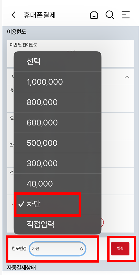 4. "한도변경"을 클릭 --> "차단" --> "변경" 을 누르시면 끝입니다.