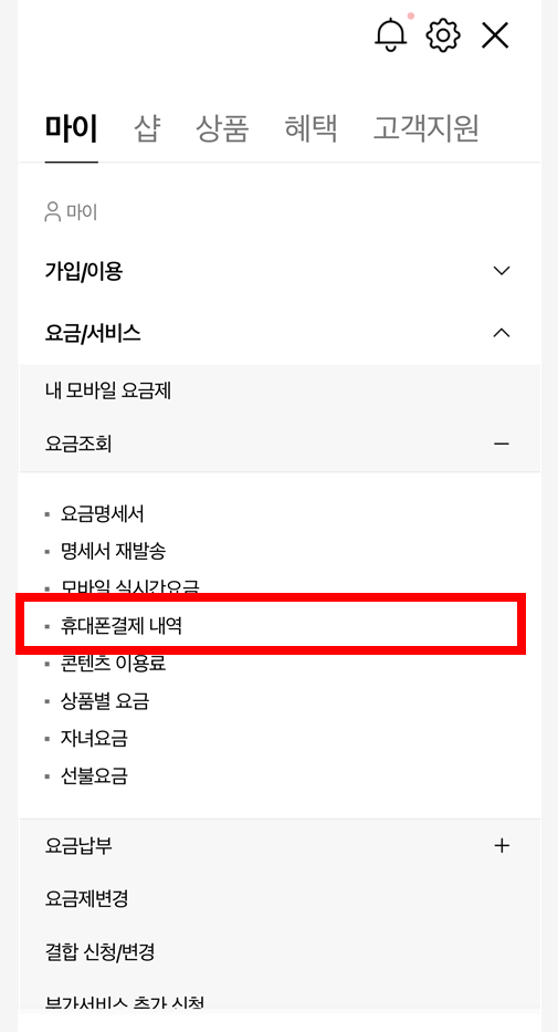 3. "요금/서비스" --> "휴대폰 결제내역" --> "이용한도 상세내역 및 한도변경"으로 들어갑니다.