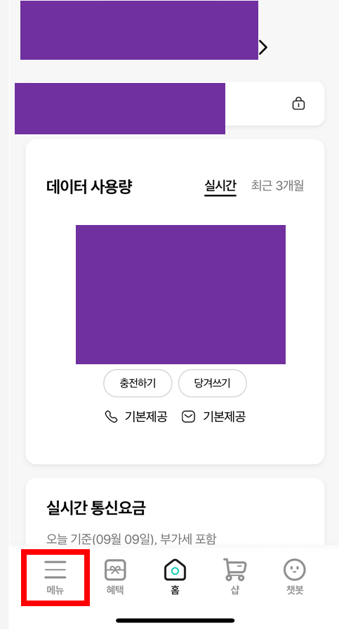 1. KT 앱에서 왼쪽 하단의 메뉴( ☰)로 들어갑니다.